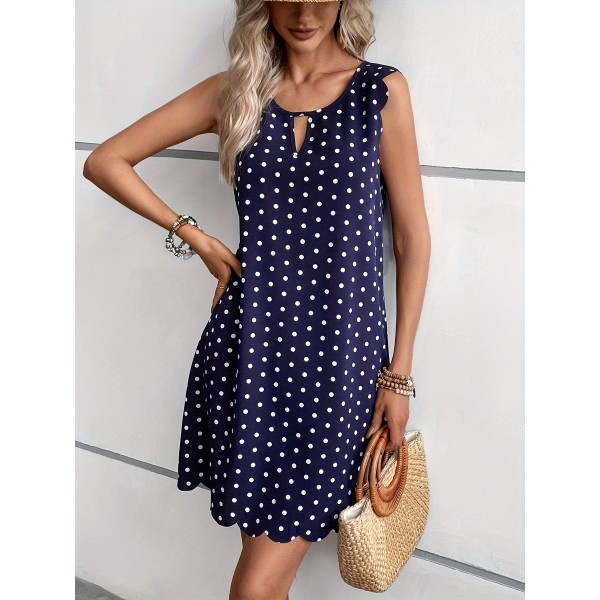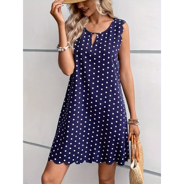 Polka Dot Print Scallop Trim Dress, Elegant Sleeveless Crew Neck Keyhole Dress For Spring & Summer, Women's Clothing