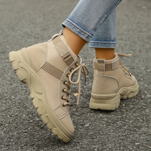 Women's Solid Color Hiking Sneakers, Lace Up Soft Sole Platform Non-slip Shoes, Versatile High-top Climbing Shoes