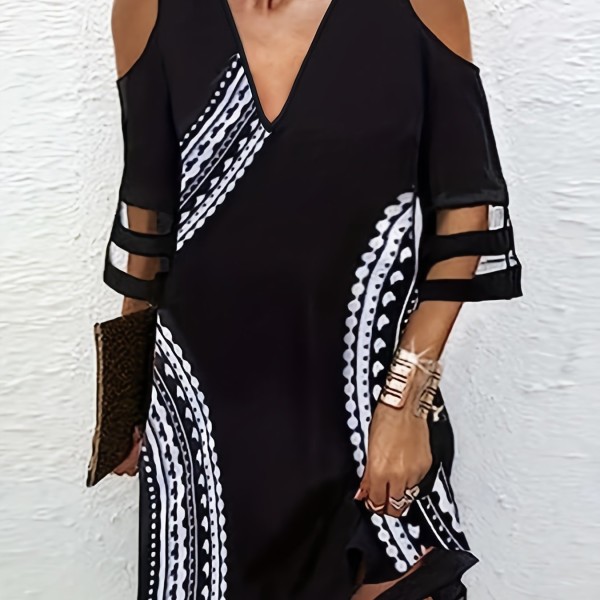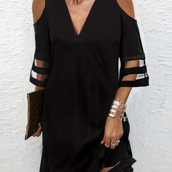 Color Block Cold Shoulder Dress, Casual V Neck Dress For Spring & Summer, Women's Clothing