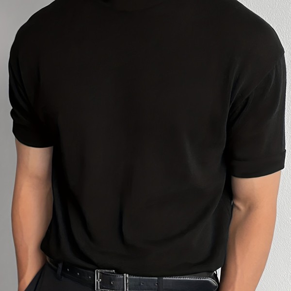 Solid Color Men's Short Sleeve Turtleneck Stretch Comfy T-shirt, Summer Streetwear